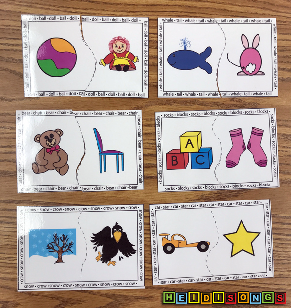 When I use these, I divide them into smaller sets and number them on the back. Since there are 20 pairs of rhyming words, you could divide them into sets of five pairs each. Just be SURE to number them on the back, because if they get all mixed up it can be pretty hard for the kids to get them put back together! Twenty pairs of words means forty puzzle pieces. Yikes! :) Our Rhyming Puzzles Sets are here.