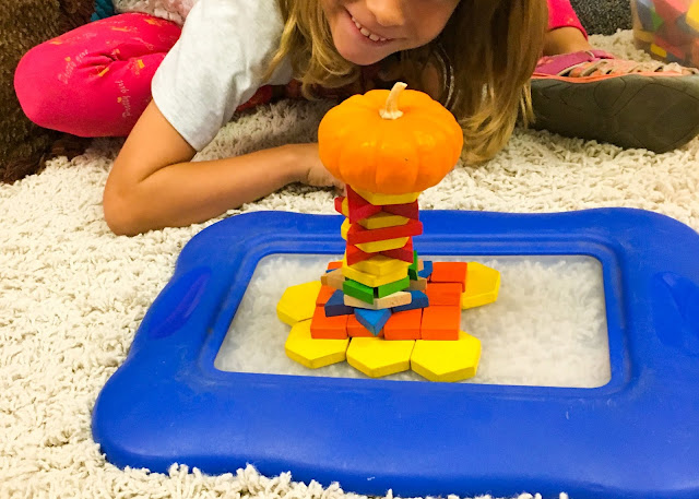 Second, find a fair or random way to let the children choose their building supplies. I used their Class Dojo points to choose who could choose first. The child with the most points got to choose a partner to work with and together they chose a set of manipulatives or toys to build with. Then I told them to grab a mini pumpkin, choose a spot in the classroom where there would be a little room to themselves, and start building!